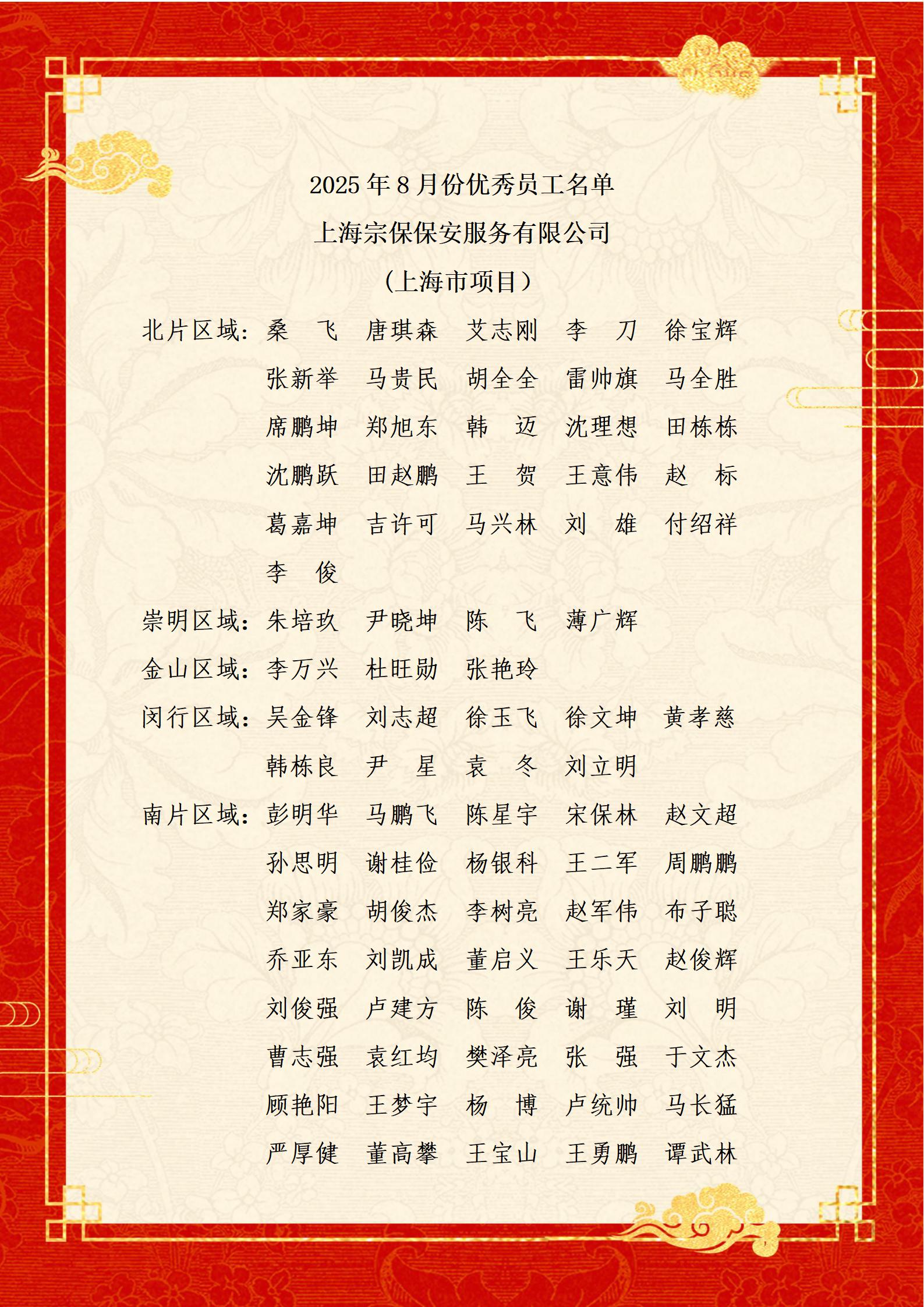 8月份,公司广大员工根据甲方的任务要求,按照公司的部署安排,认真践行公司“规范经营 诚信为本 服务至上”的发展理念,顶着烈日冒着酷暑,坚守岗位勤勉作为,助力完成了上海蓝鲸世界购物中心开业交通秩序维护等多项大型活动安保任务,全力配合甲方做好了城市管理辅助、治安巡逻联防、物业服务保障、生态环境保护、高铁线路巡防等工作。期间,涌现出了一批尽心履责、岗位建功、拾金不昧、热心助人的优秀员工和先进典型。