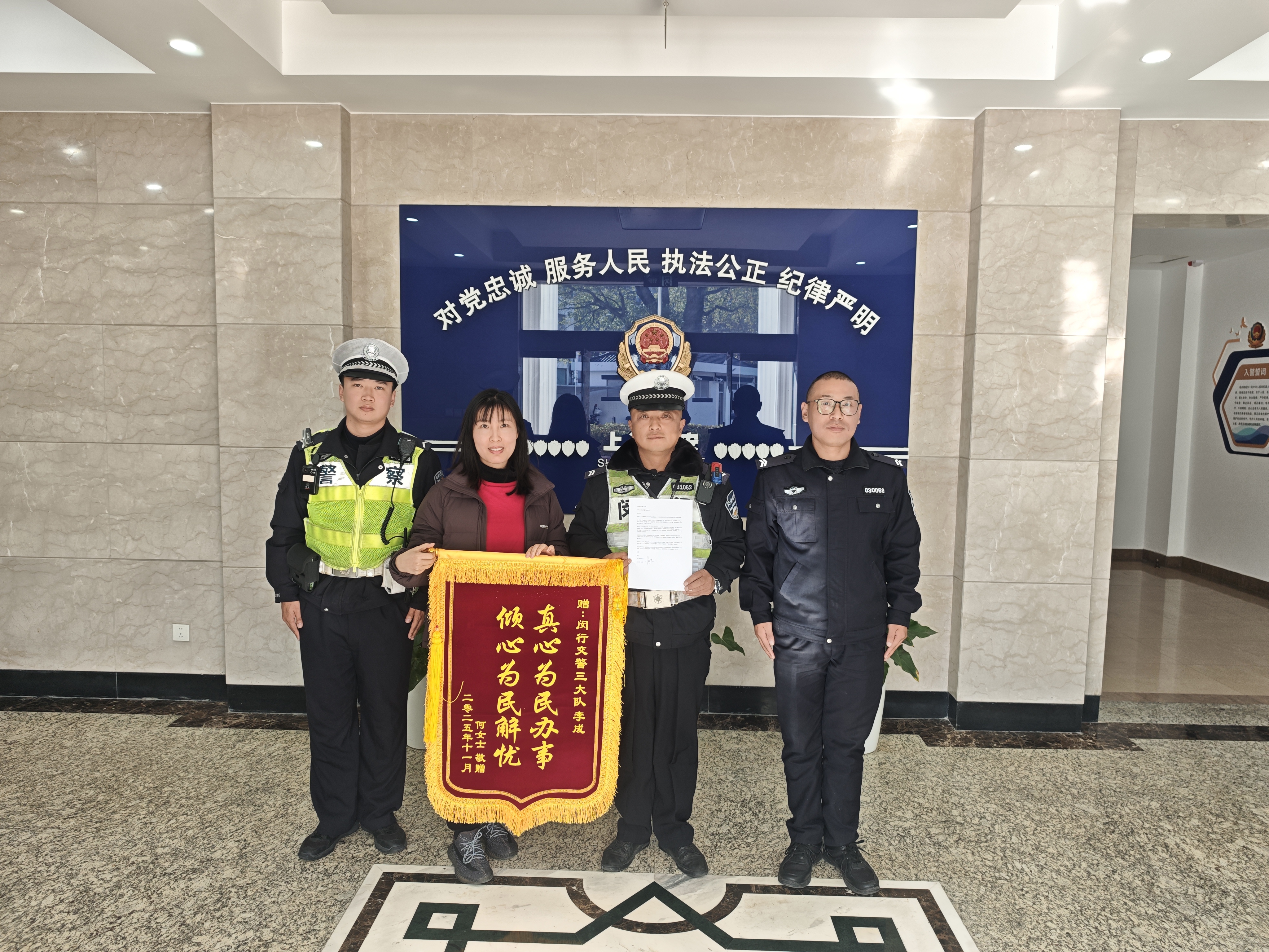 12月4日,宗保公司驻浦东新区临港新城派出所辅助项目员工王俊远在协助民警处置一起警情时,凭借高度的工作责任心与细致耐心的工作态度,成功帮助市民宋女士追回被盗外卖,赢得市民真挚赞誉。事后,宋女士专程送来一面绣有“雷霆出击 破案神速”的锦旗,表达对王俊远及派出所高效为民工作的充分肯定与衷心感谢。