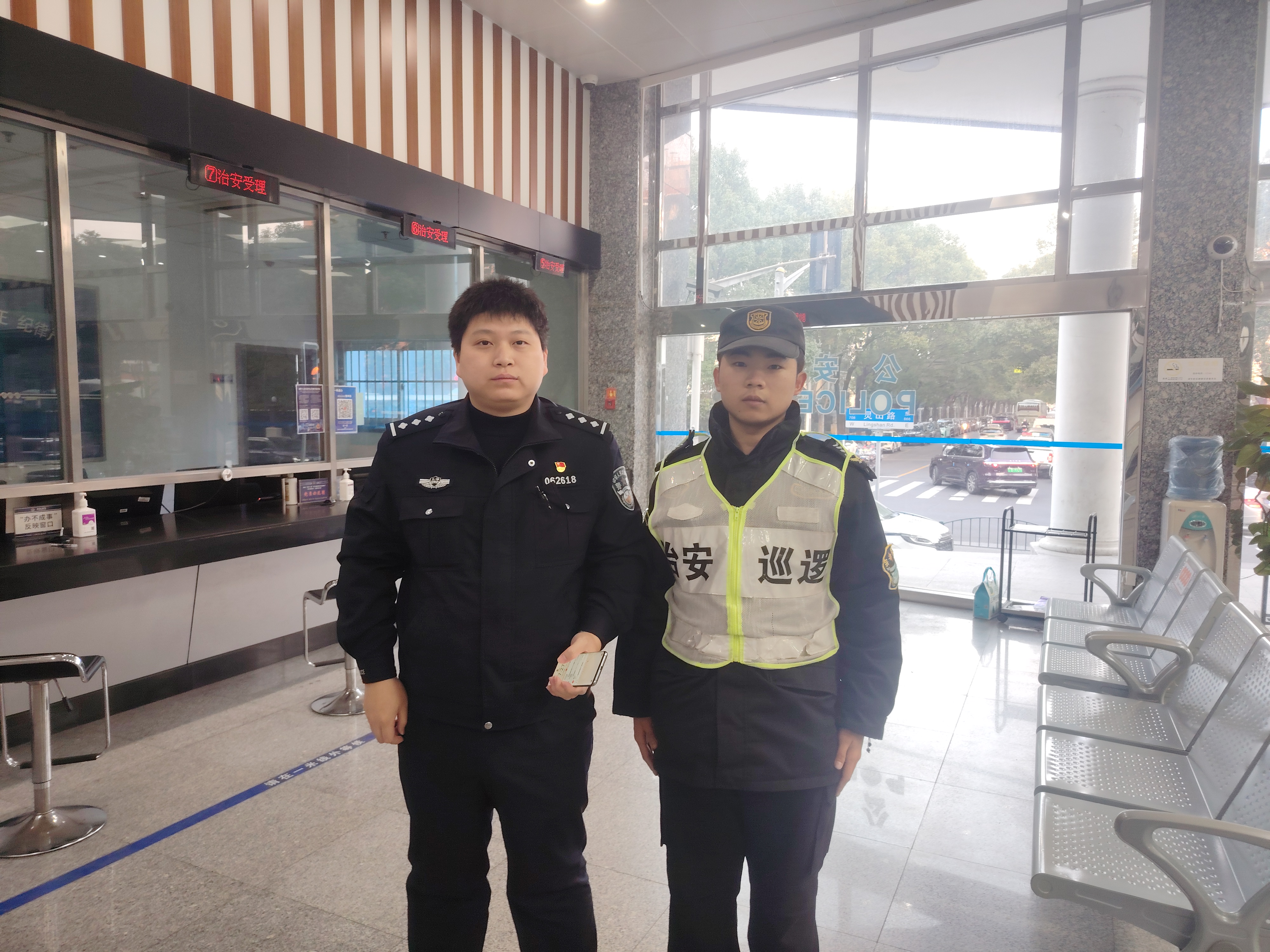12月17日6:45,宗保公司驻浦东新区洋泾派出所辅助项目员工韩迈途经崮山路626弄明珠苑小区门口时,捡到一部华为手机。询问路人无果后,韩迈将情况报告了班组长,并按要求在原地等待。