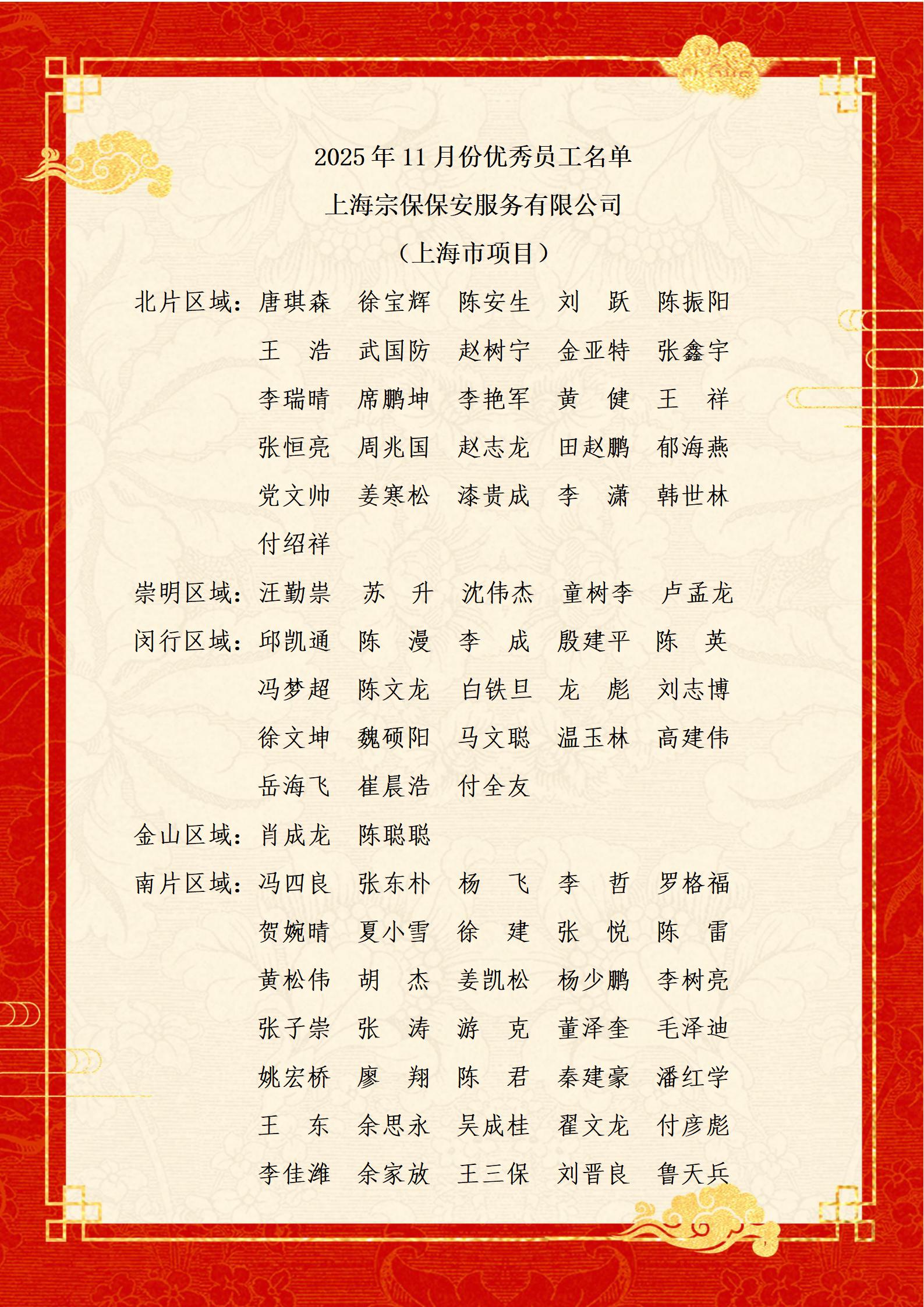 11月份,公司广大员工紧紧围绕甲方任务要求,严格落实公司部署安排,深入践行“规范经营 诚信为本 服务至上”发展理念,助力完成了第八届中国国际进口博览会等多项大型活动安保任务,全力配合甲方做好了城市管理辅助、治安联勤联防、物业服务保障、生态环境保护、高铁线路巡防等工作。期间,涌现出了一批尽心履责、岗位建功、拾金不昧、热心助人的优秀员工和先进典型。