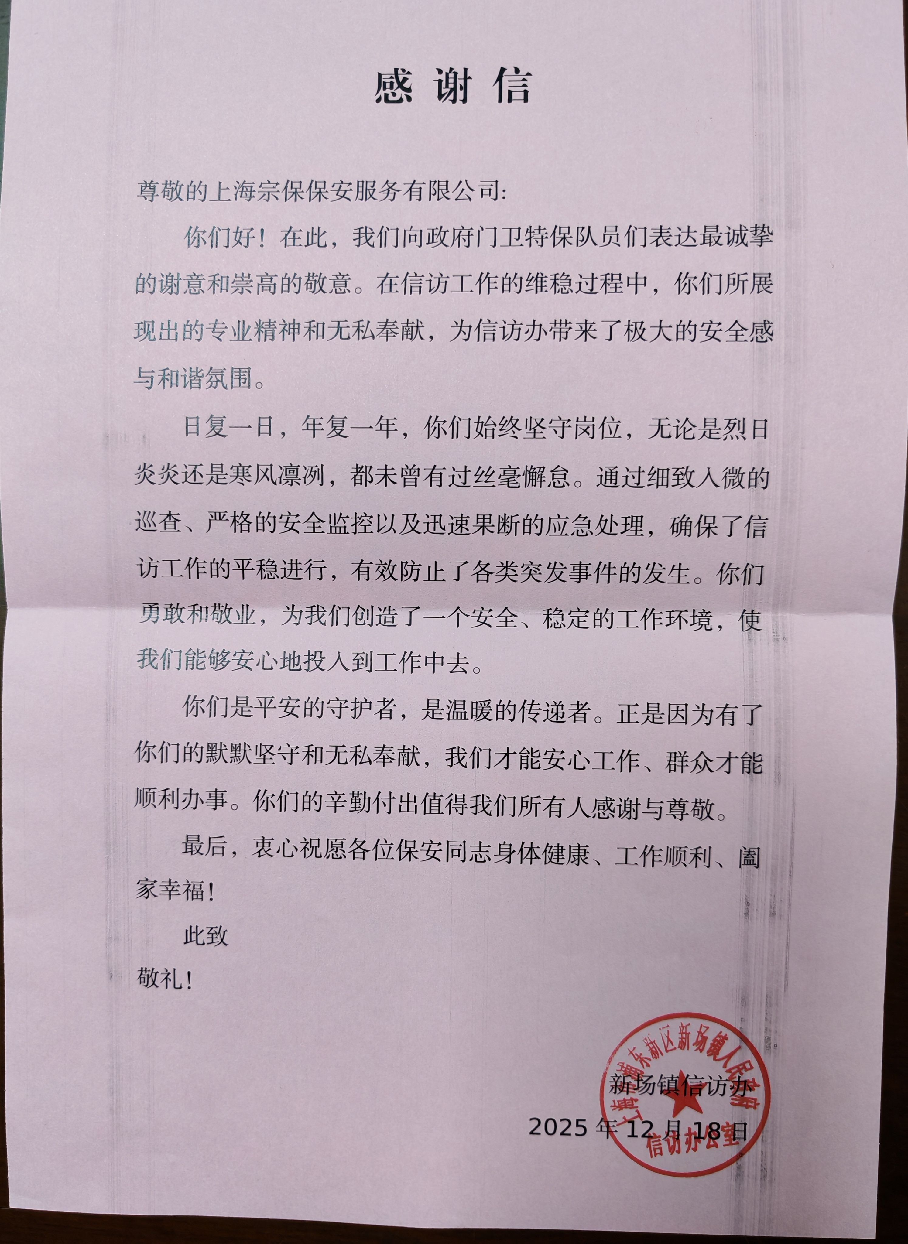 12月18日,公司收到浦东新区新场镇人民政府信访办的感谢信,信中对公司员工展现的专业素养与担当善为精神给予了表扬。