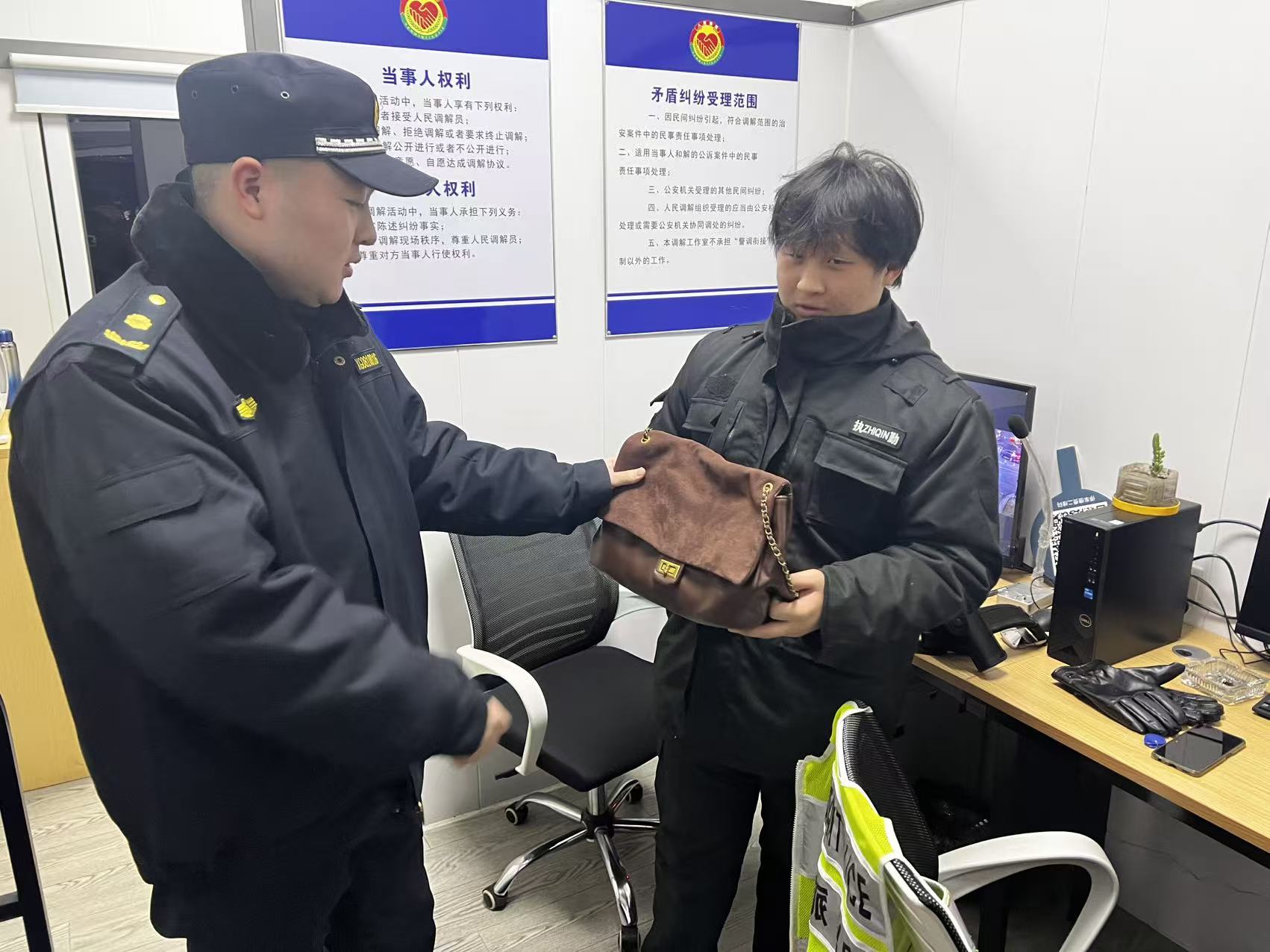 12月31日16:43,浙江民泰公司驻杭州市临平区新城市容项目员工余炎峰在望梅路新丰路路口巡查时,捡到一个手提包,随即将情况报告了带班负责人,并按指示在原地边巡查边等待失主。