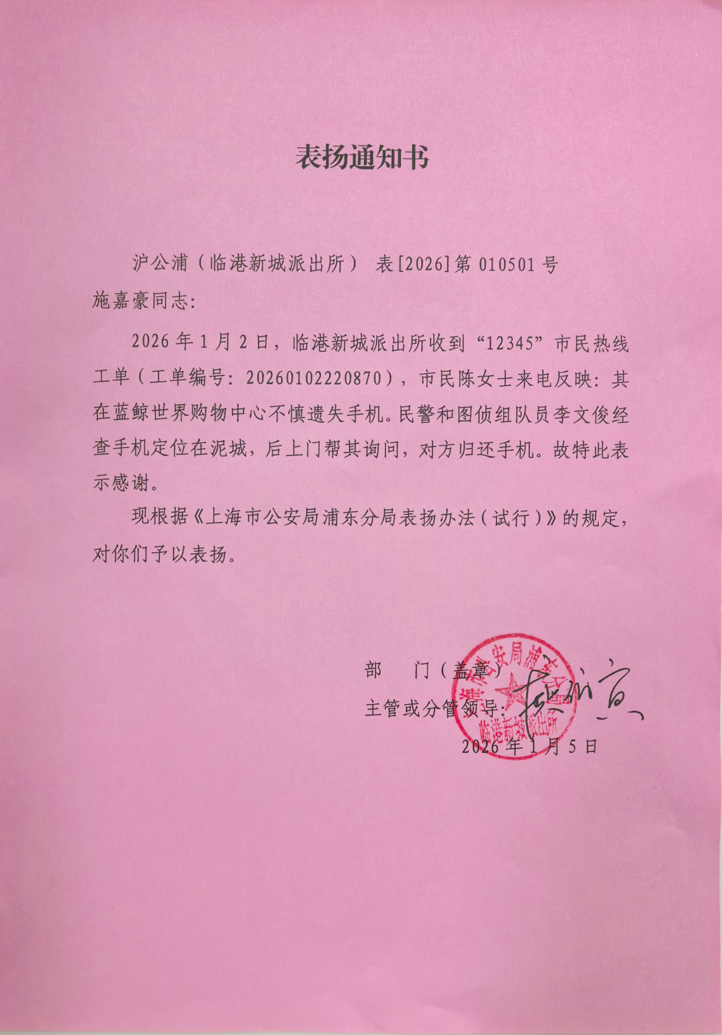 1月5日,宗保公司驻浦东新区临港新城派出所辅助项目收到临港新城派出所的表扬通知书,对员工李文俊认真负责、耐心细致帮助市民陈女士成功寻回手机的出色表现予以表扬。