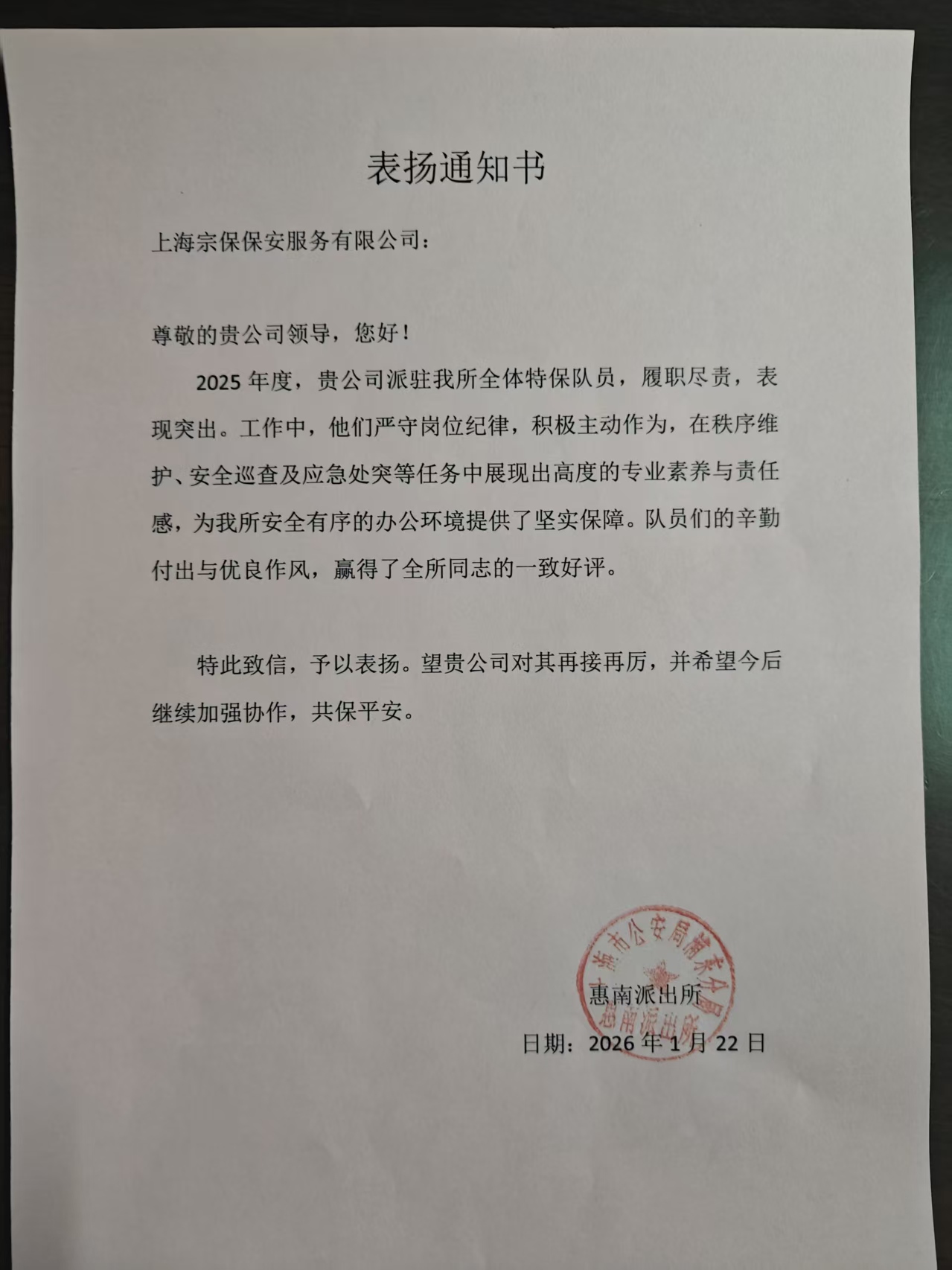1月22日,宗保公司驻上海市浦东新区惠南派出所辅助项目收到惠南派出所赠送的一面绣有“作风优良 能打胜仗”的锦旗和一份表扬通知书,通知书感谢公司对派出所工作的大力支持,表扬公司员工严守工作纪律、积极主动作为,在全力协助派出所完成秩序维护、安全巡查、应急处突等任务中所展现的优良素质。