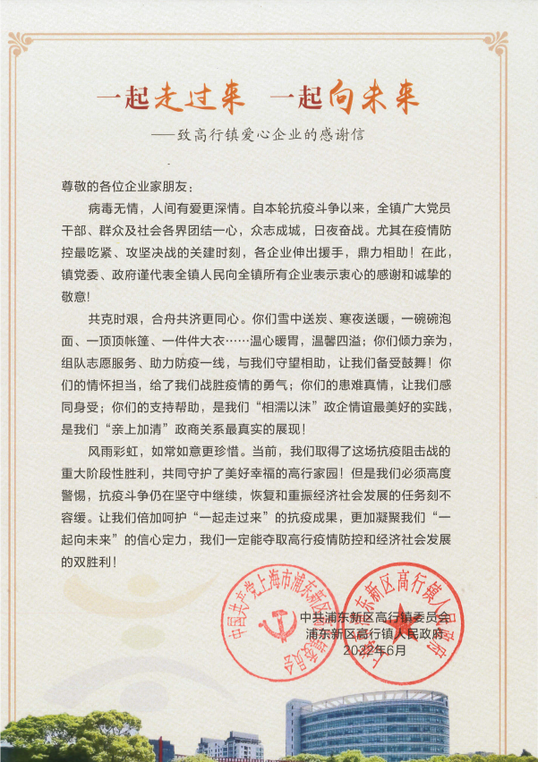 6月9日,宗保公司收到浦东新区高行镇人民政府的感谢信,感谢公司对高行镇疫情防控工作的大力支持。
