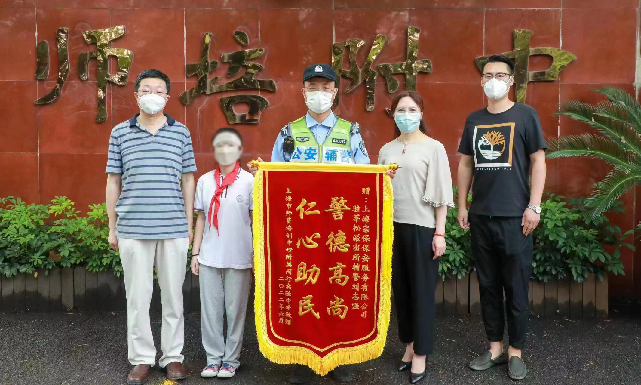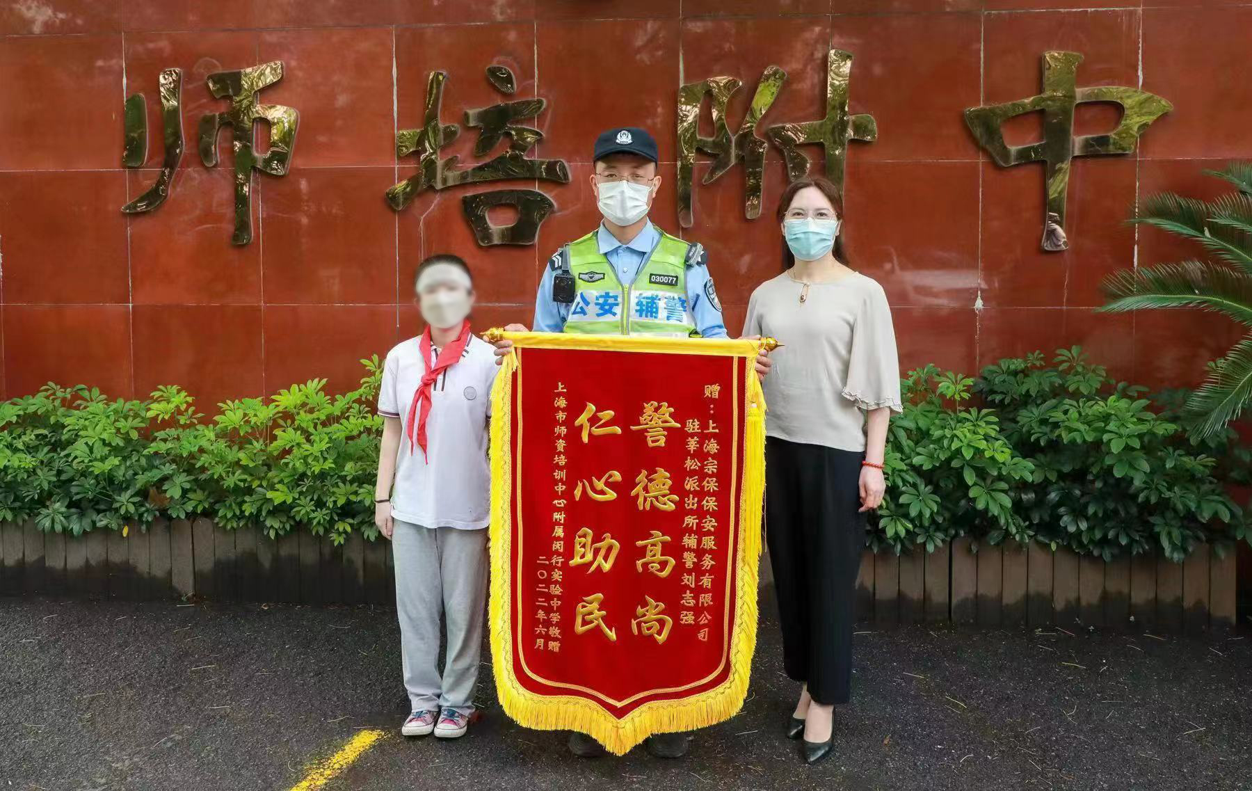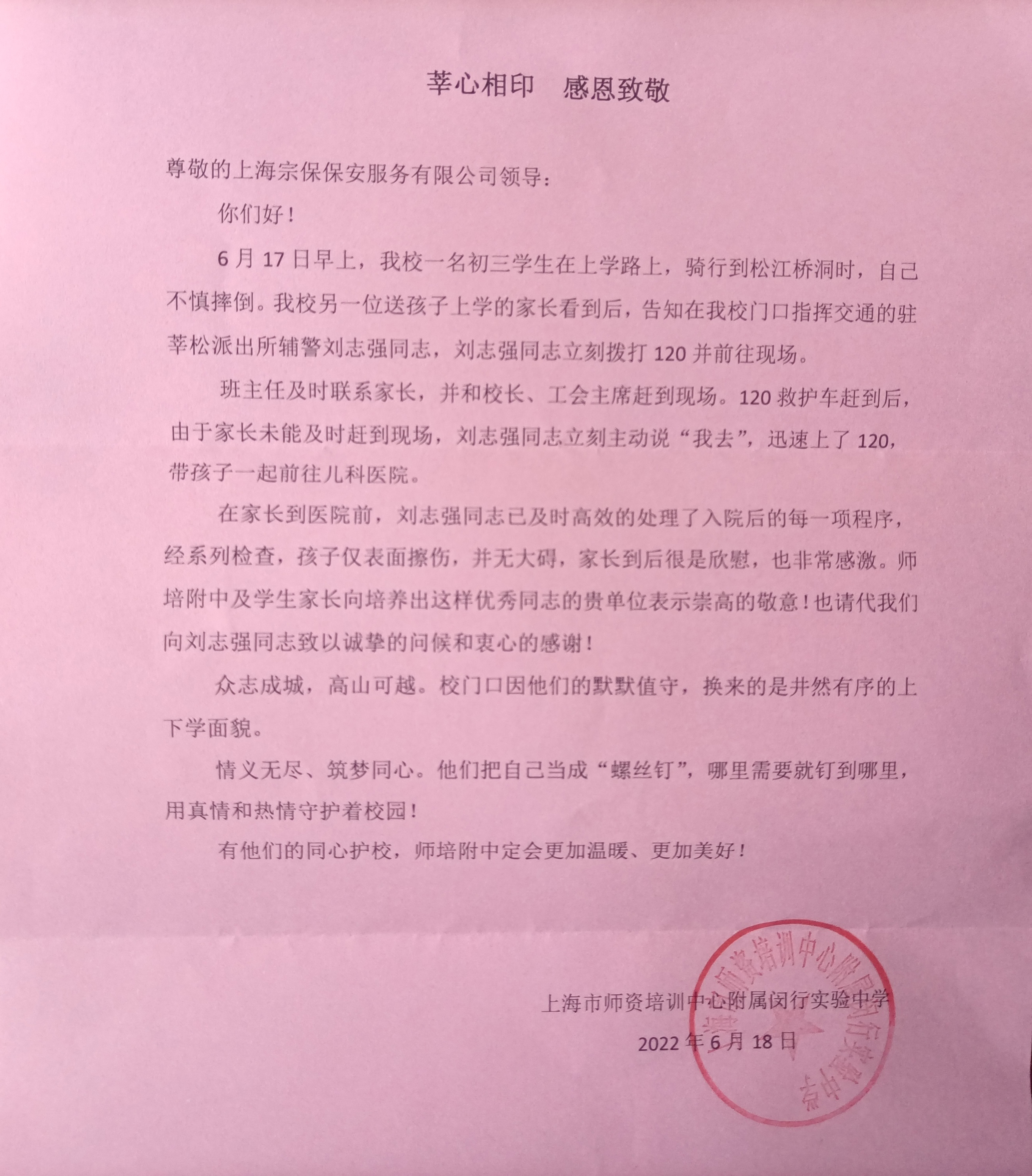 6月18日,宗保公司驻莘松派出所项目员工刘志强收到闵行实验中学送来的一面绣有“警德高尚 仁心助民”的锦旗和一封感谢信,衷心感谢他护送摔伤学生就医的行为。