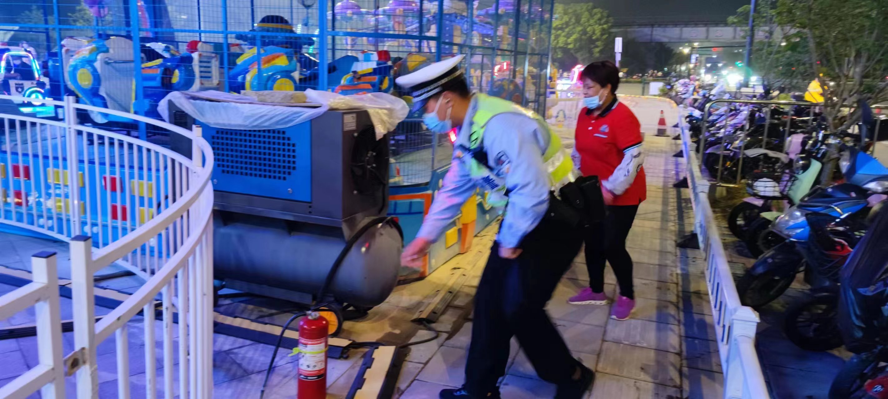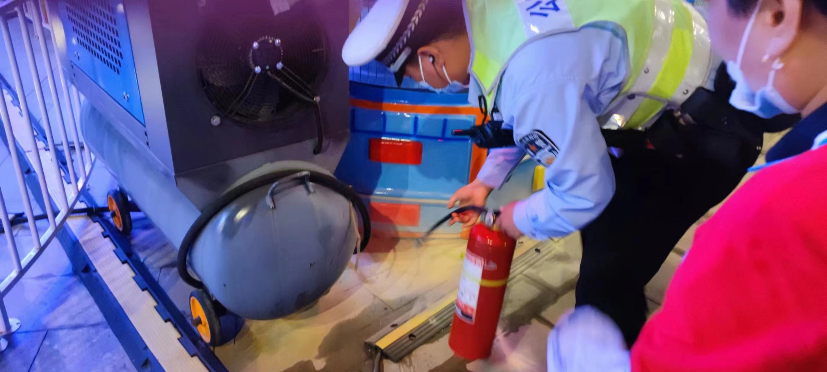 当日19:45,余安国和李家生在泥城万达广场1号口附近巡逻时,广场上一儿童娱乐设施出现故障,发现有浓烟从设备内部冒出。