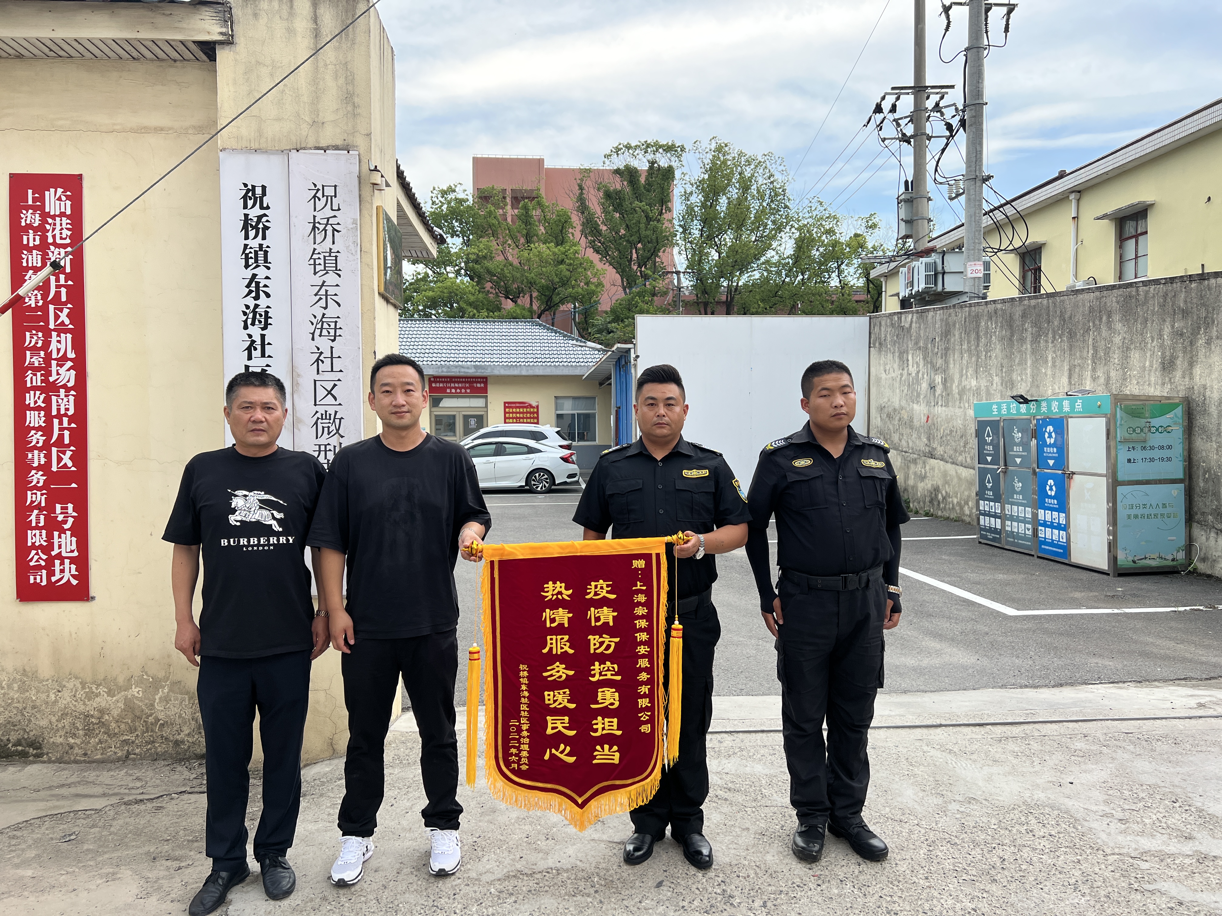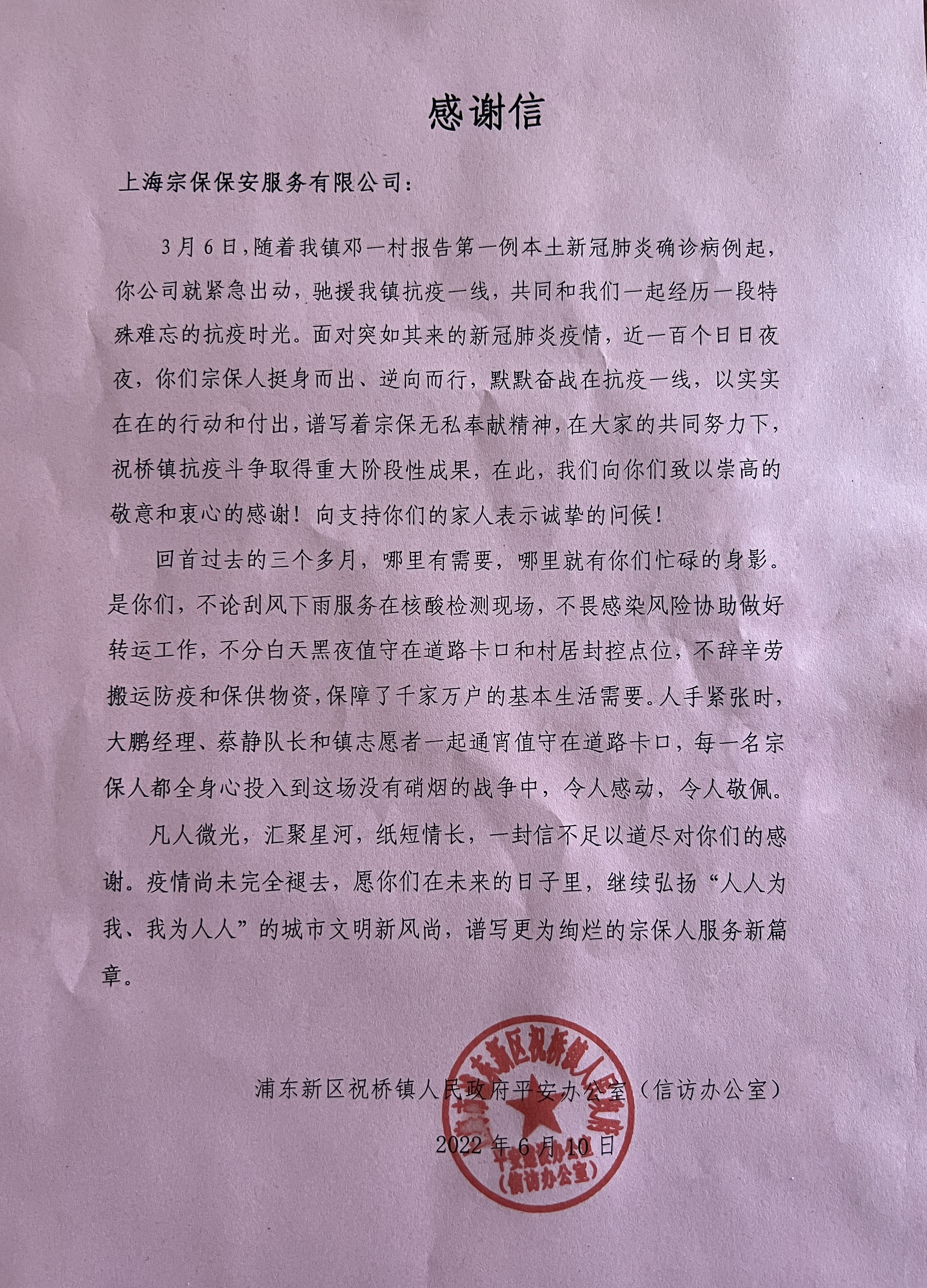 6月29日,宗保公司分别收到祝桥镇人民政府平安办公室的感谢信和祝桥镇东海社区绣有“疫情防控勇担当 热情服务暖民心”的锦旗,感谢宗保公司在镇疫情防控工作中所做的工作。