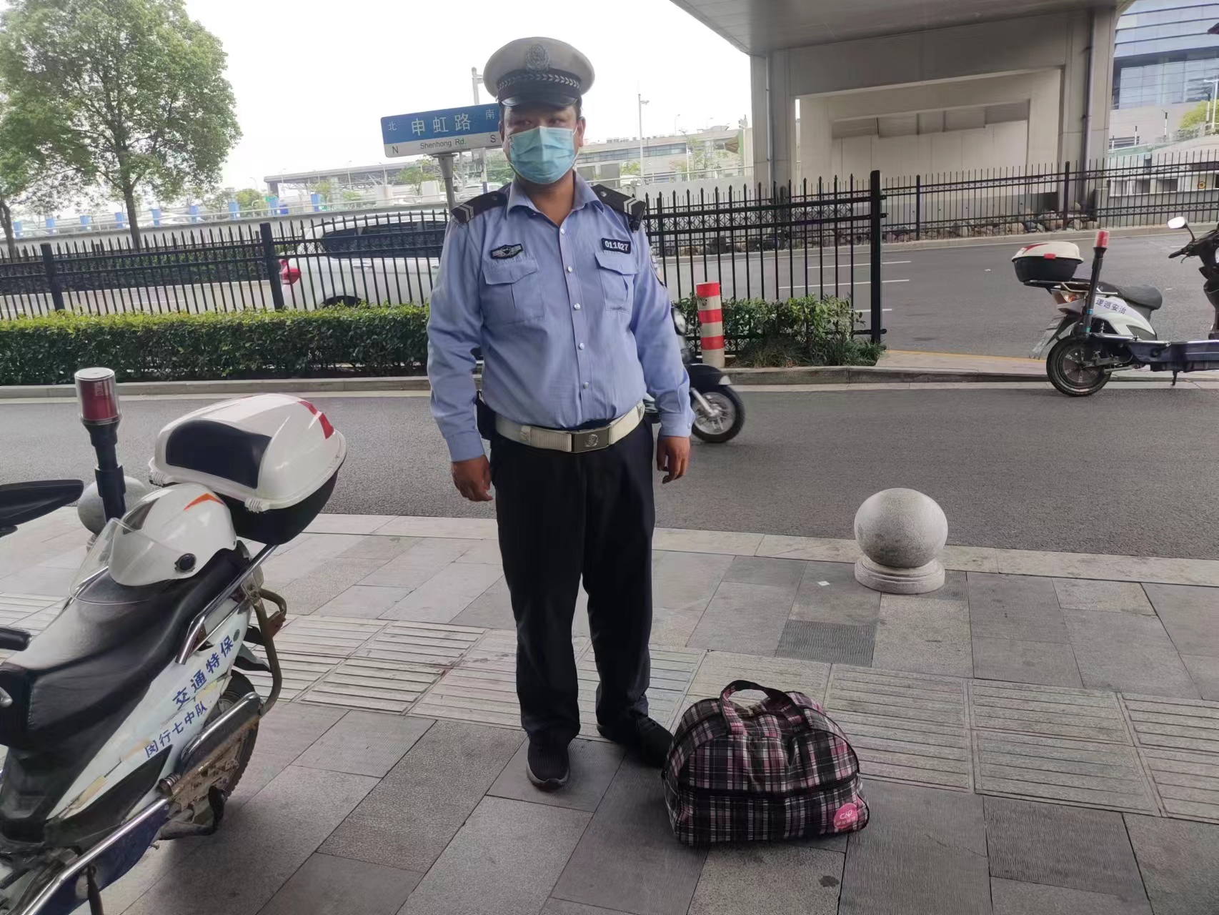 7月9日17:02,公司驻闵行华漕护校项目员工李志鹏巡逻至虹桥火车站申虹路段康得思酒店门口时,捡到一个行李包和一张身份证,上交民警帮寻失主。