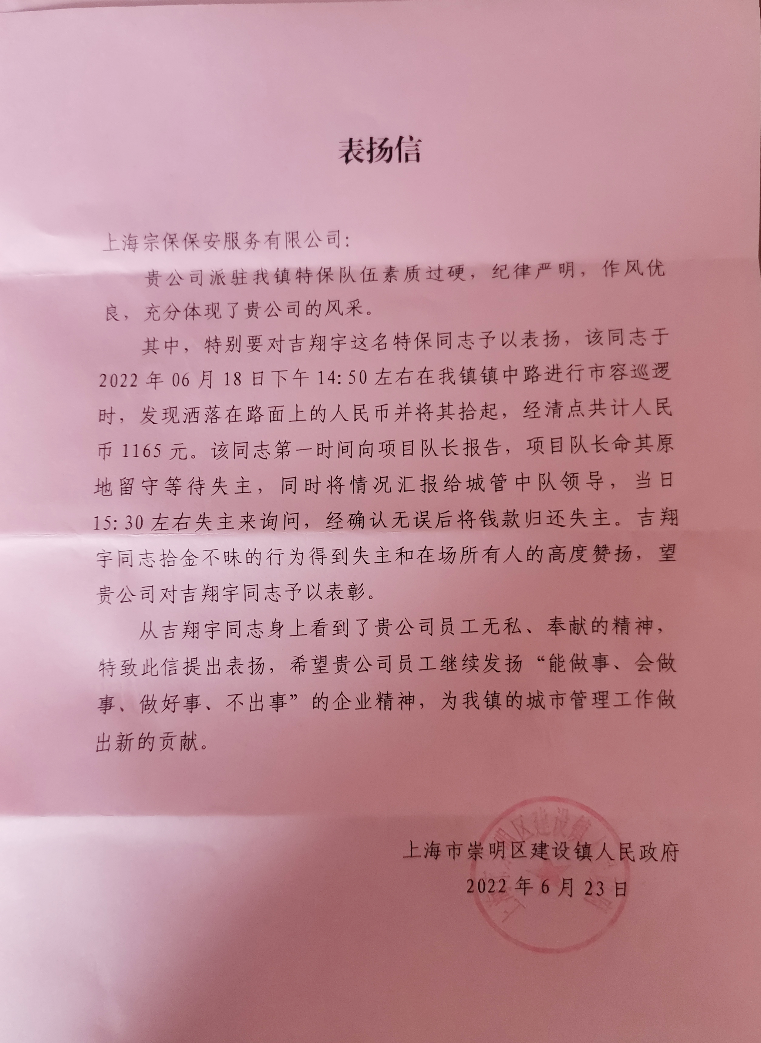 6月23日,宗保公司驻崇明区建设镇项目收到建设镇人民政府的一封表扬信,信中对公司员工吉翔宇拾金不昧的行为给予表扬。