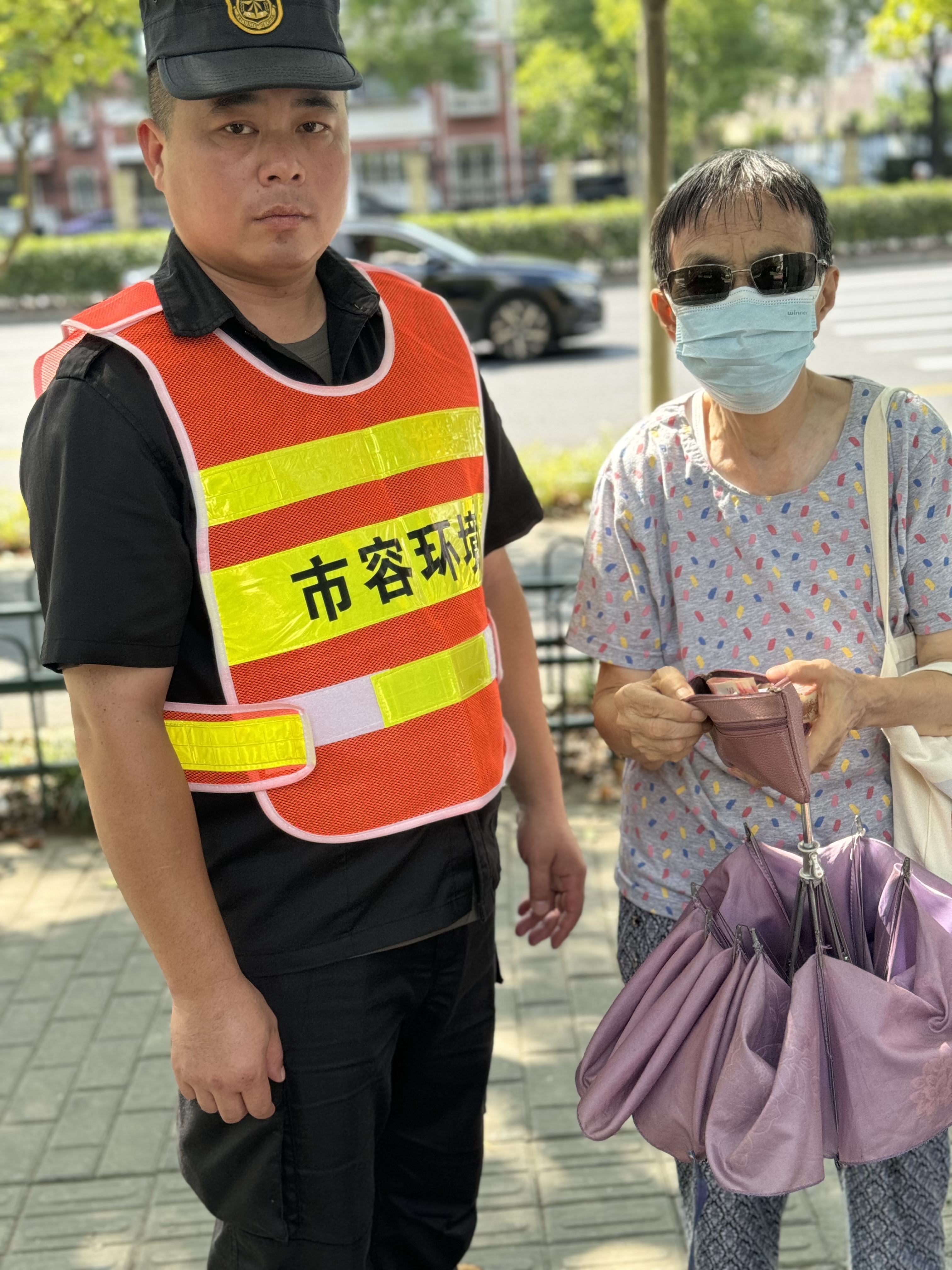 9月9日10:40,宗保公司驻浦东新区南码头市容项目员工桑飞巡逻至浦三路675号时,捡到一个粉色手包,内有500元现金、身份证、银行卡、社保卡等物品。考虑到失主可能会返回寻找,桑飞将情况报告项目负责人后便在原地等待。