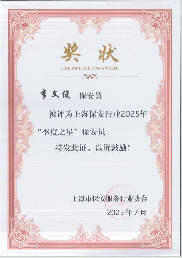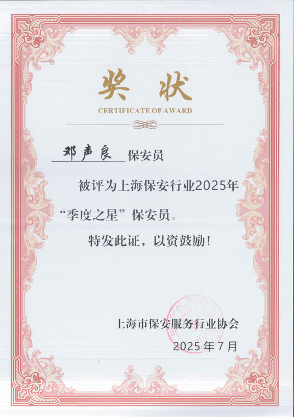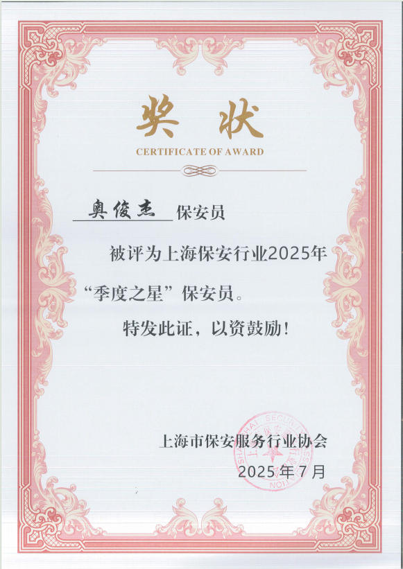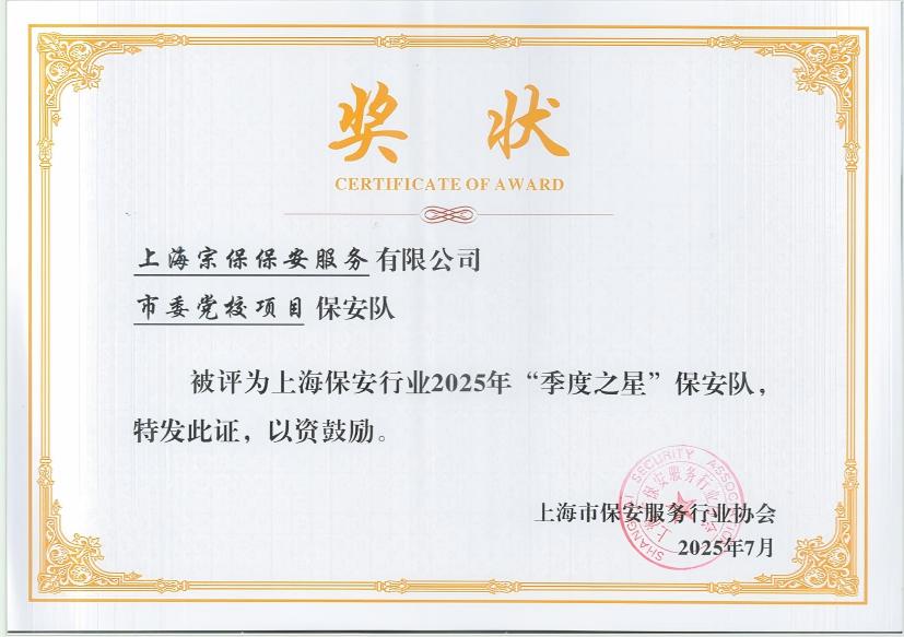 近日,上海市保安服务行业协会公布了上海保安行业2025年第二季度优秀保安队、保安员展示名单,宗保公司1个项目保安队和3名员工个人获此殊荣。