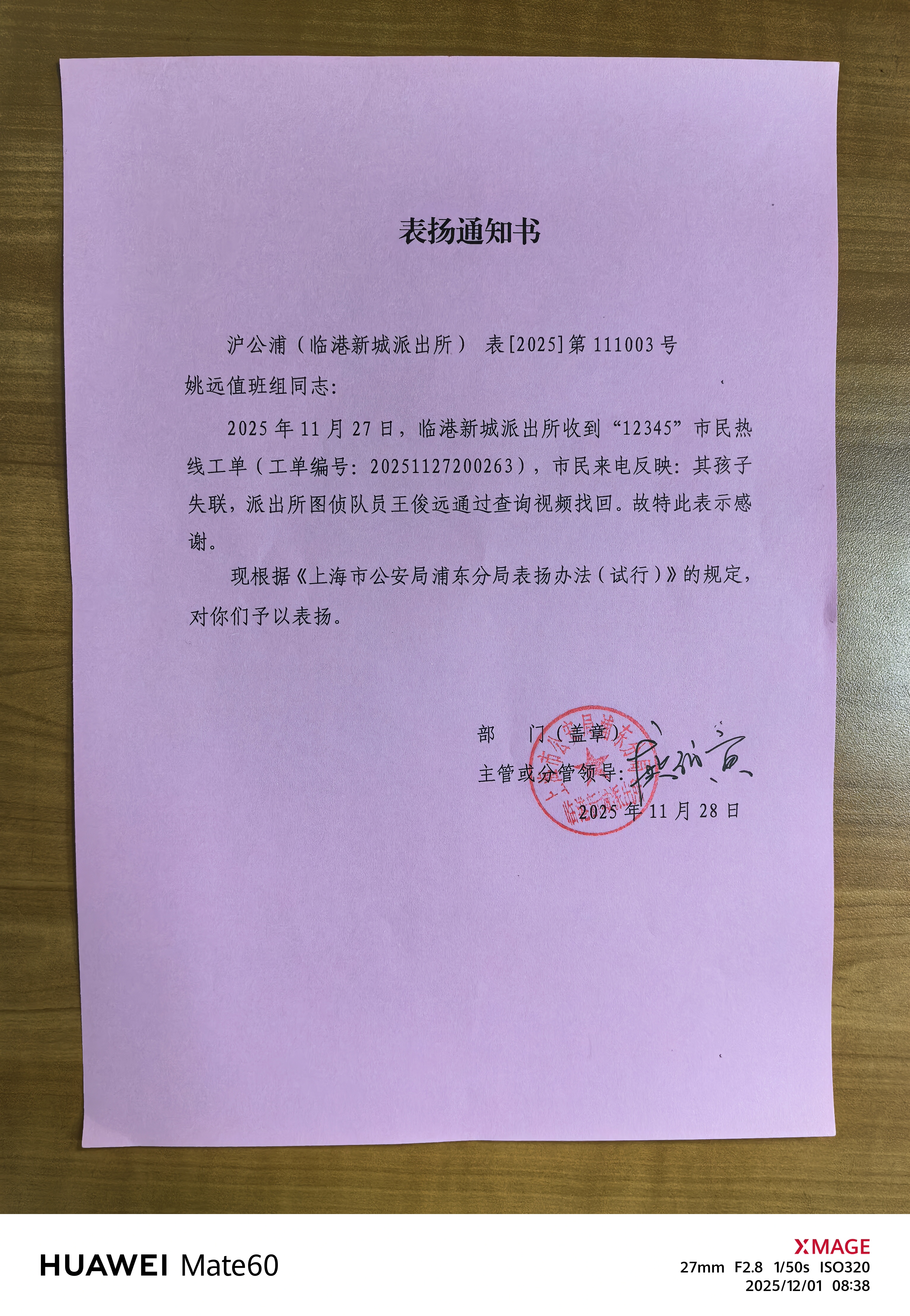 12月4日,宗保公司驻浦东新区临港新城派出所辅助项目员工王俊远在协助民警处置一起警情时,凭借高度的工作责任心与细致耐心的工作态度,成功帮助市民宋女士追回被盗外卖,赢得市民真挚赞誉。事后,宋女士专程送来一面绣有“雷霆出击 破案神速”的锦旗,表达对王俊远及派出所高效为民工作的充分肯定与衷心感谢。