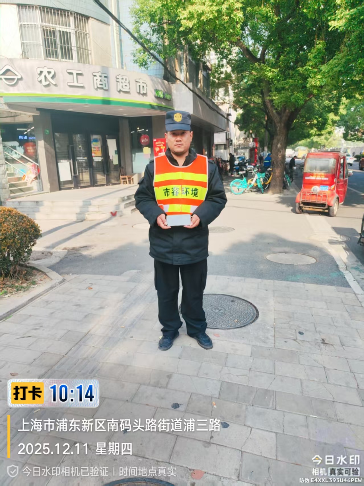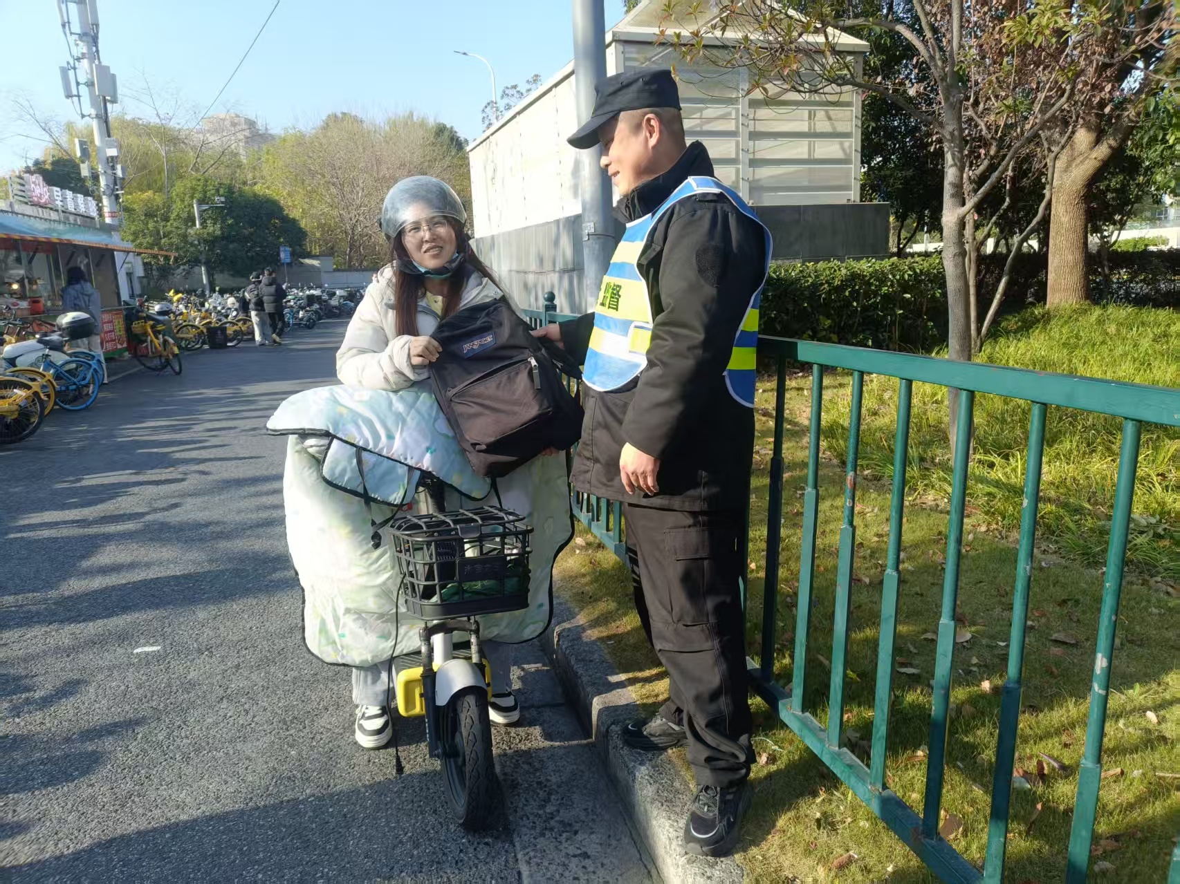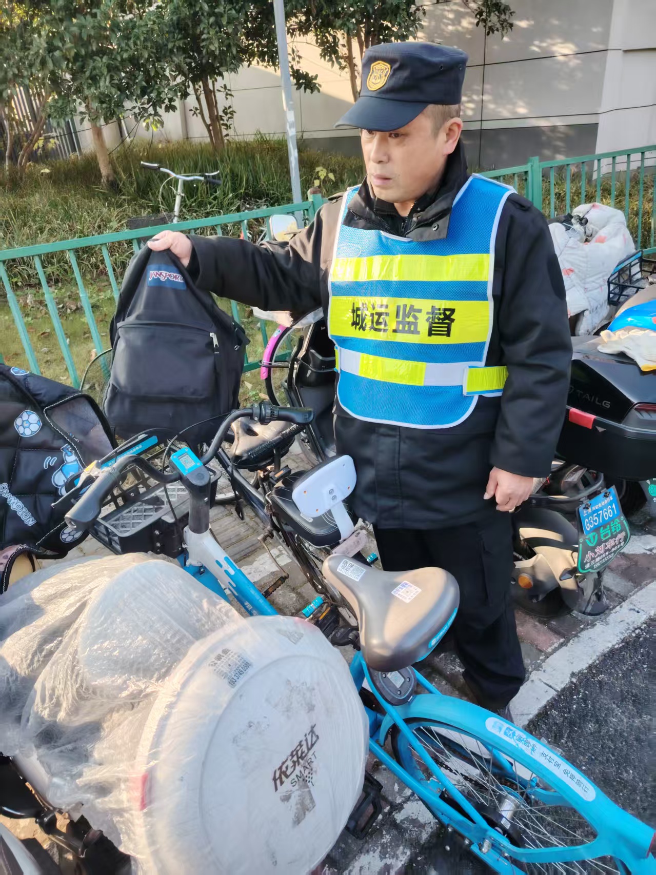 12月18日8:20,宗保公司驻浦东新区南码头路街道城运辅助项目员工陈安生在临沂新村地铁站2号口整理共享单车时,在一辆共享单车车筐里发现一个背包,内有一部苹果iPad和若干文件。考虑失主可能会返回寻找,陈安生便在原地边执勤边等待失主。