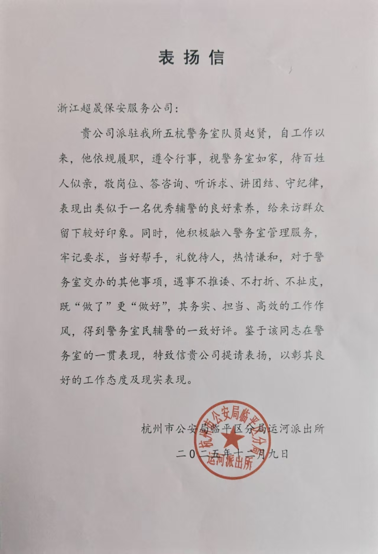 12月9日,浙江民泰公司驻杭州市临平区运河派出所辅助项目收到一封运河派出所的表扬信,信中充分肯定了公司员工赵贤出色的工作表现。