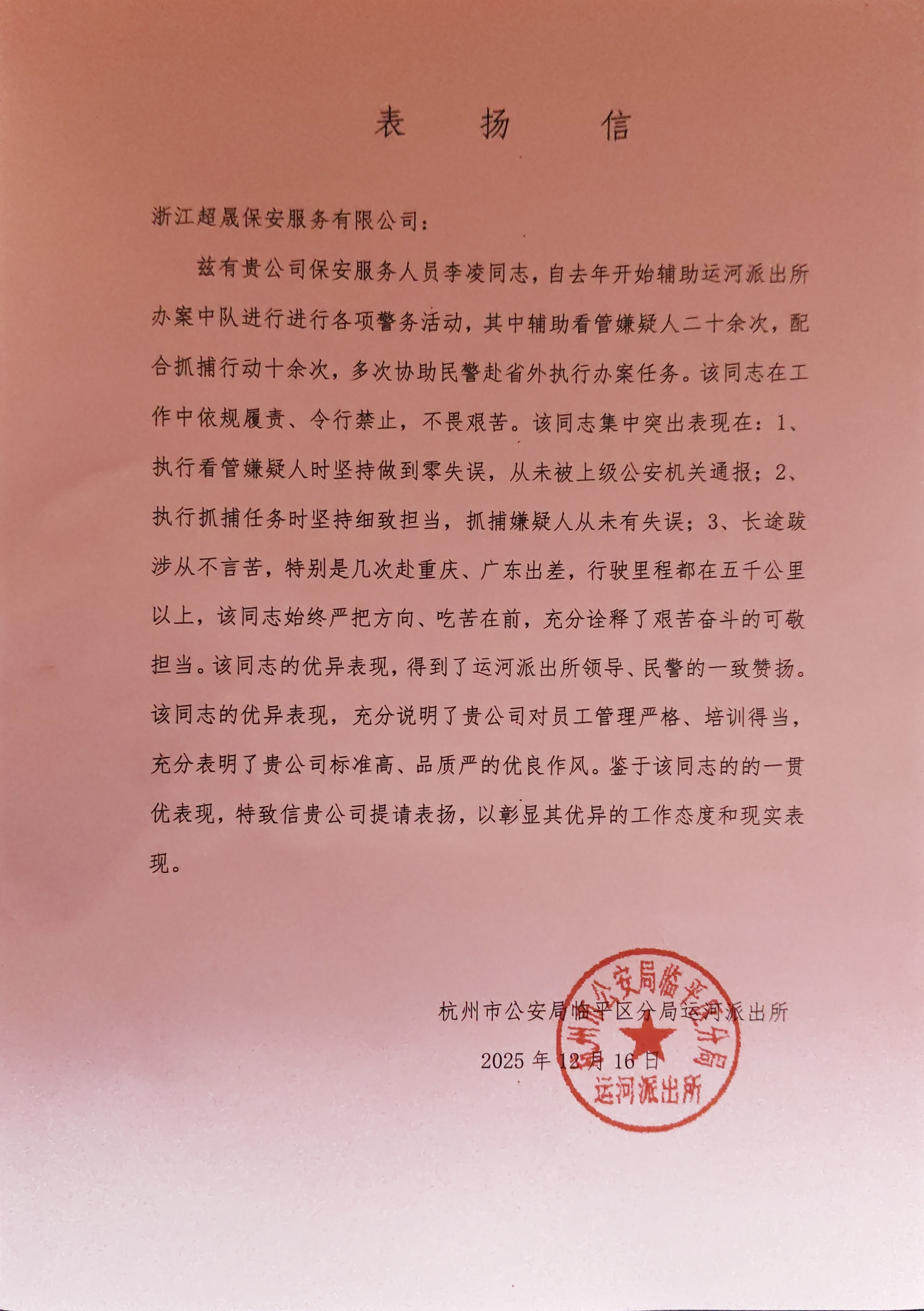 12月16日,浙江民泰公司驻杭州市临平区运河派出所辅助项目收到一封运河派出所的表扬信,信中表扬了公司员工李凌出色的工作表现。