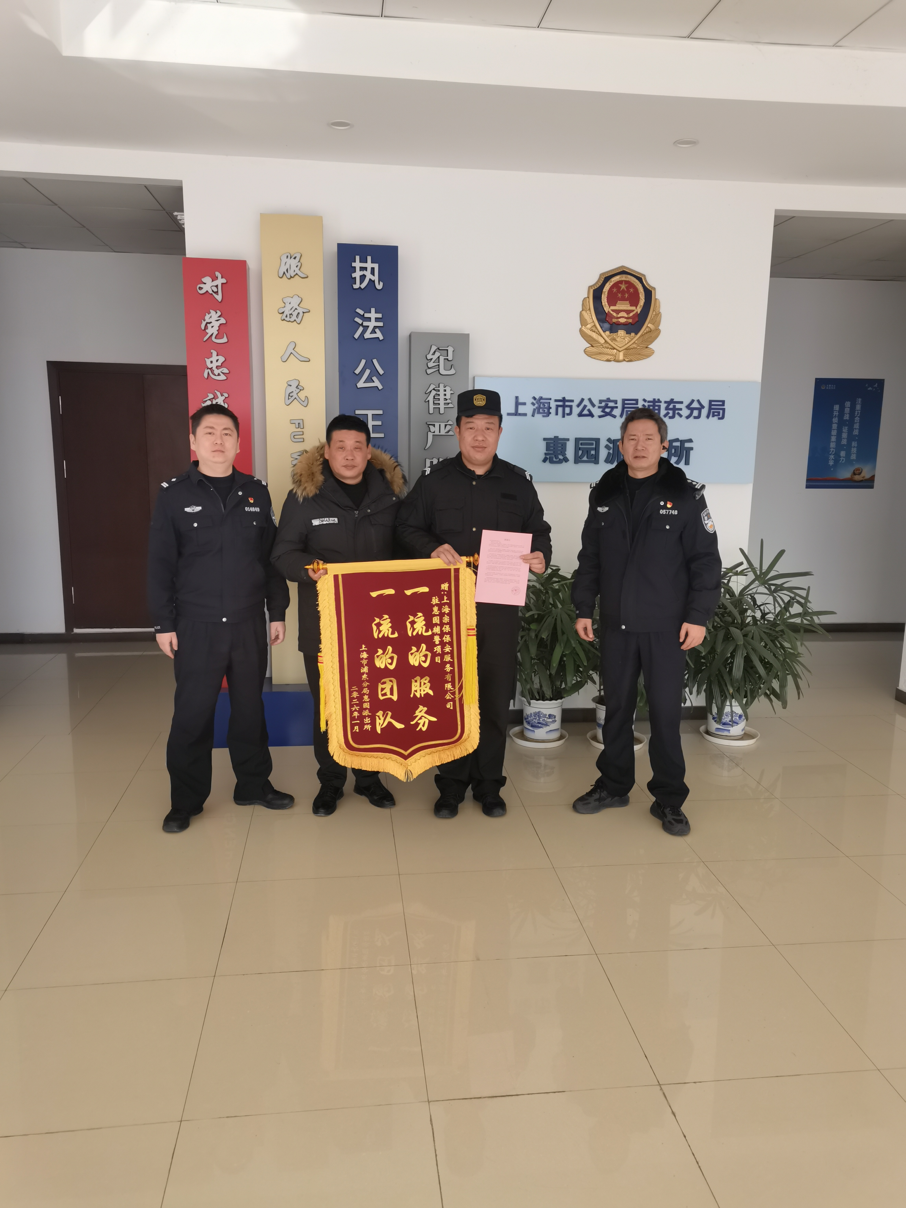 1月22日,宗保公司驻浦东新区惠园派出所辅助项目收到惠园派出所赠送的一面绣有“一流的服务 一流的团队”的锦旗和一封感谢信,感谢公司对派出所治安防控工作的大力支持,表扬了公司员工爱岗敬业、认真负责的工作精神。