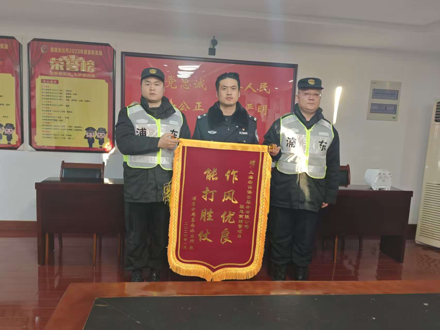 1月22日,宗保公司驻上海市浦东新区惠南派出所辅助项目收到惠南派出所赠送的一面绣有“作风优良 能打胜仗”的锦旗和一份表扬通知书,通知书感谢公司对派出所工作的大力支持,表扬公司员工严守工作纪律、积极主动作为,在全力协助派出所完成秩序维护、安全巡查、应急处突等任务中所展现的优良素质。