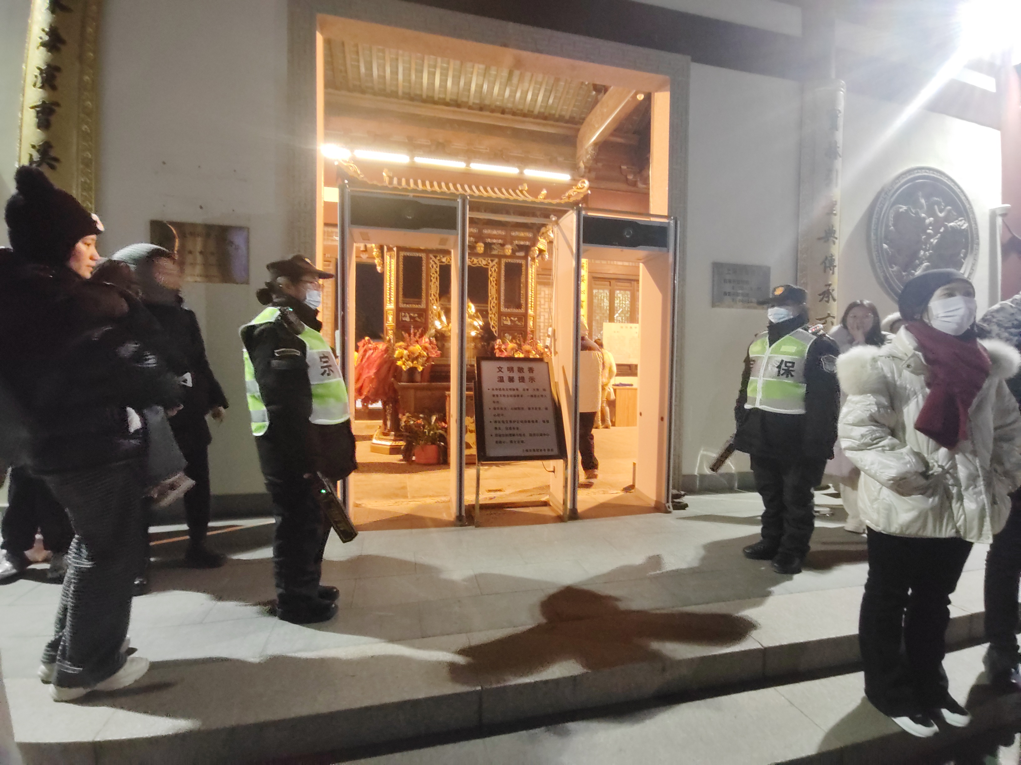跨年当晚,公司全体安保人员提前三小时到岗,迅速投入工作。在寒风凛冽的冬夜里,他们始终坚守岗位、精神饱满,在入口处有序引导、核验信息;在核心区域,维护秩序、疏导人流,耐心解答游客咨询,主动帮扶老人、儿童等需要帮助的群众。他们用专业与温暖,默默守护着每一份虔诚的祈愿,赢得了市民游客的广泛赞誉。