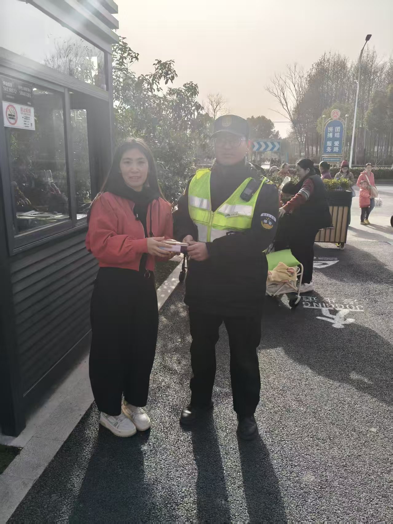 16:10左右,一位身穿红色外套的女子急匆匆赶到西门岗亭认领手机。吴振远通过女子现场解锁手机,确认其是失主后,就把手机归还给了她。女子拿着手机,连连向宗保员工吴振远道谢。