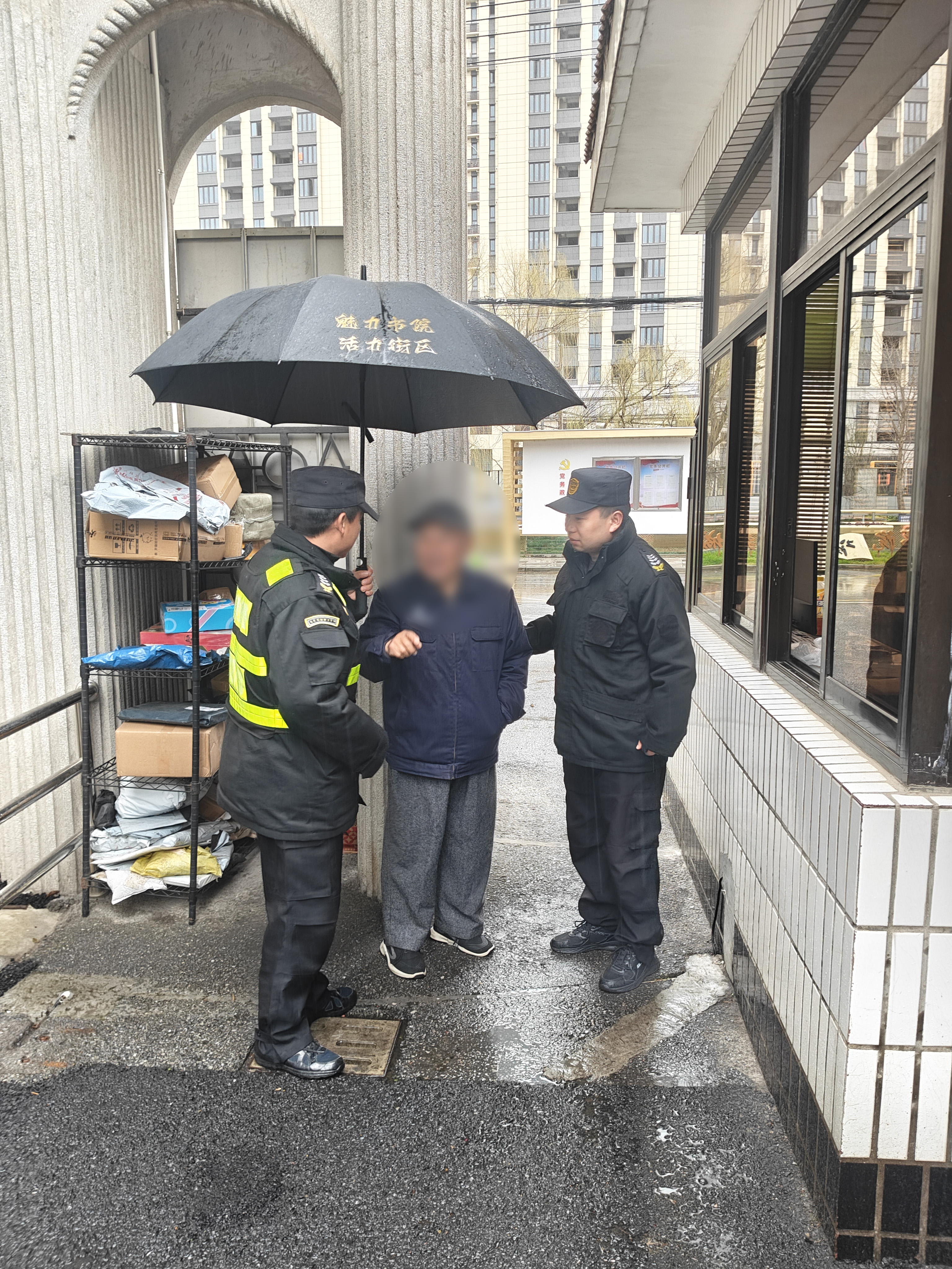 3月1日10:50,宗保公司驻浦东新区书院派出所辅助项目员工陈将在书院镇政府门岗执勤时,发现一位老人神情迷茫,在雨中徘徊。此时尽管下着雨,但老人却未撑伞,行动迟缓,显得十分无助。