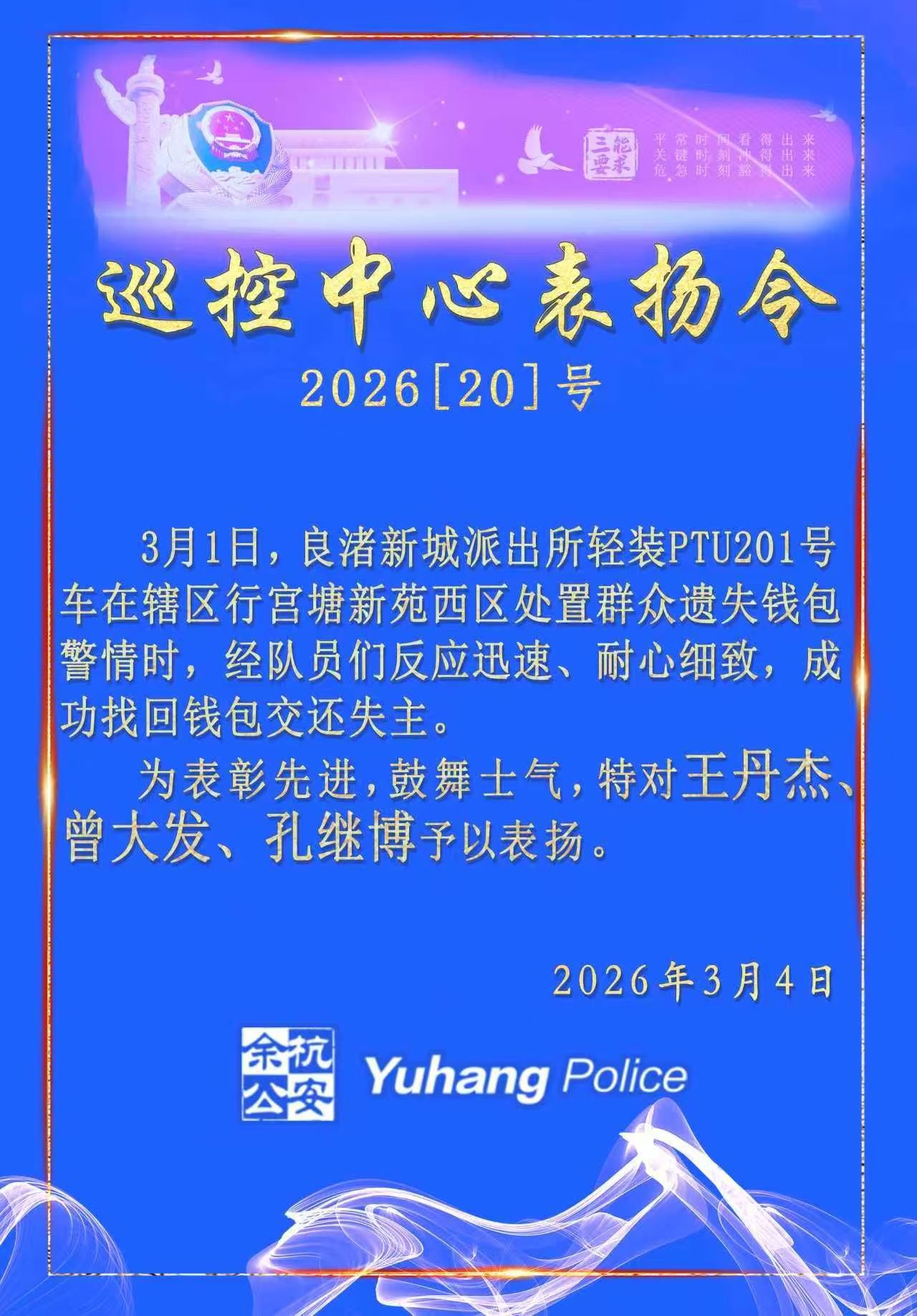 近日,浙江超晟公司驻杭州市公安局余杭区分局良渚新城派出所辅助项目员工曾大发和孔继博在轻装PTU机动队车长王丹杰的带领下,通过耐心劝导、细致讲法,成功说服捡拾人归还钱包,帮助市民范女士寻回遗失的12400元现金,受到市民范女士赠送锦旗赞扬和余杭区公安分局巡控中心发布表扬令通报表彰。